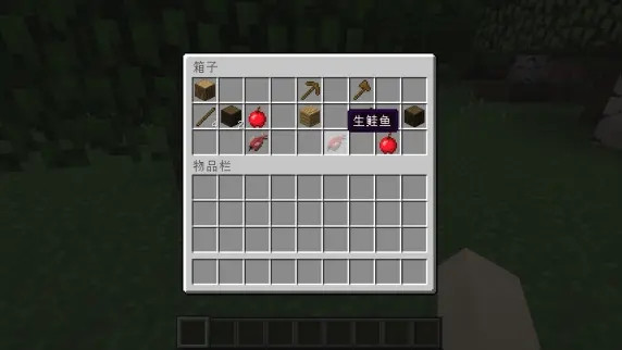 让我们凑近一点看看,里面包括了四块原木,一个木材,一根木棍,一把木镐和一把木斧。还有生鲑鱼与苹果——这些都是我们第一天求生所需要的必须品,奖励箱的物品没有什么特别好的东西,但是对于初期的玩家来说是非常有用的。