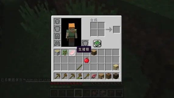 所以,我们要学会保护自己,还要好好按时吃饭,物品栏上方右边的鸡腿栏就是饥饿度了,我们开采矿物,砍伐树木,甚至于跑步游泳都会让我们的饥饿度下降,我们如果太饿了,会无法奔跑,甚至会损失生命,所以我们一定要好好吃饭,但是要避免吃坏掉/有毒/生的肉制品食物,它会给我们带来许多不好的影响。所以我们把猪排先存在背包里。
