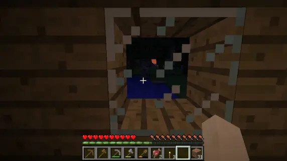 值得注意的是,挖掘矿洞的时候最好挖掘出阶梯,这样方便我们以后来回。如图所示,我们已经可以看到石头了,让我们使用木镐来开采一些石头吧!