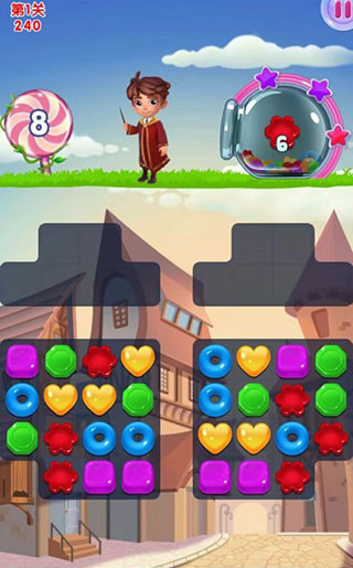 6、把4颗糖果连在一起会形成强力的魔法特效,启动它会消除直线上的所有糖果