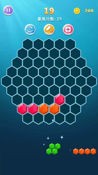 5、六边形消除:玩法较之经典数独游戏更自由,横、左斜、右斜都可消除得分,同样是备选方块无法放置时消除游戏结束。