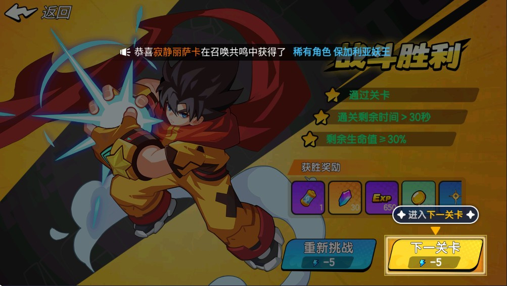 战斗胜利之后可以获得丰厚的奖励,还可以进入到下一关卡