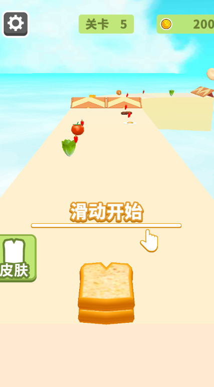 1、进入游戏后,手指滑动屏幕控制方向,面包会自动前进,你需要捡取赛道上的食材。