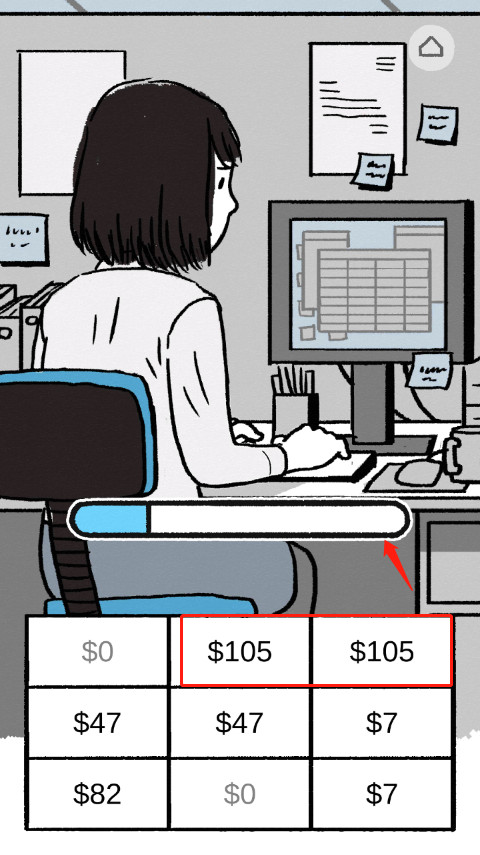 6、到公司了,开始努力上班啦,点击两种数量相同的$钞票,直到进度条满了,就完成今天的工作啦。