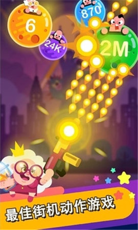 英雄爆破小怪骚动是一款融合弹球物理机制与星际激战元素的街机冒险手游。你将化身太空舰长,驾驭战舰驰骋星际战场,直面Dr.Do率领的外星军团与海量小怪,扛起守护地球的重任。游戏以“弹射即射击”为核心设计,滑动屏幕即可操控战舰,借助弹球轨迹的反弹特性实现多角度攻击,兼具操作精度考验与策略趣味。