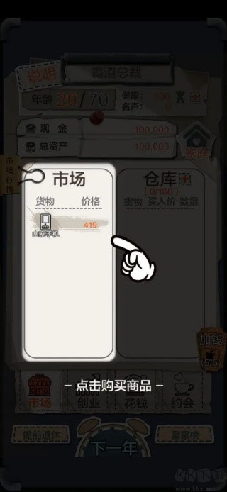 花钱:点击消费品可购买,不同消费品对名声和健康值的影响不同