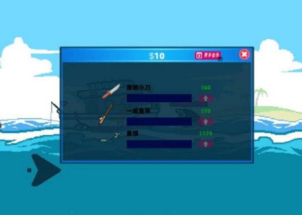 3. 在商店当中的厅,可以花费一定的钞票,购买更加新进的小刀,鱼饵,鱼草等等,让你的效率能够大大提升。