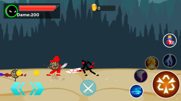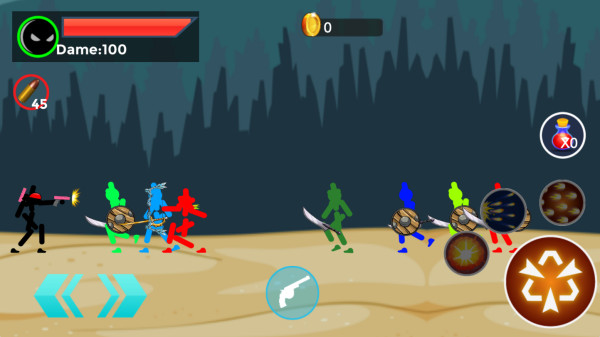 2、左侧按钮操控火柴人移动攻击方向,右侧攻击以及各种超强炫酷技能释放,灵活组合威力更强。