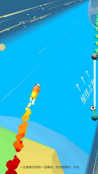 3、按住火箭,就能让火箭加速的飞升,记得多多的手机高空中的金钱获得资源;