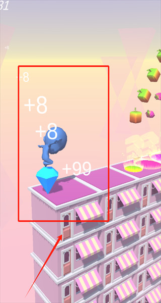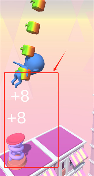 2、踩准弹簧起跳,不断撞击空中的彩虹球,就能获得8分的奖励。