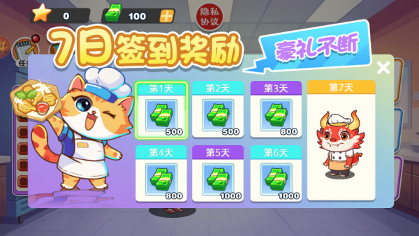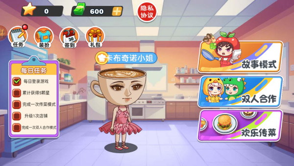 2.游戏提供每日任务,并且有三种模式:故事模式、双人合作、欢乐传菜。
