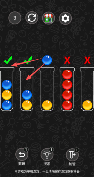 2、我们需要让相同颜色的珠子,都放入到同一个试管中,才可以进行消除。
