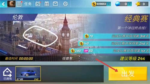 1、参与伦敦经典赛前,需确认已拥有GT86车辆且等级达到244,点击出发按钮即可开启比赛并争取冲线夺冠。