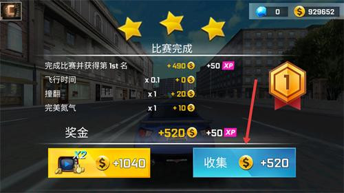 4、获得第一名后点击收集按钮,领取520美元和50点经验值,用于后续解锁更强赛车或升级现有座驾性能。