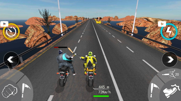 3、进入游戏后,通过左右两侧底部的按键来对其他车手进行攻击,施展你的暴力行为。还能使用右侧上方的氮气极速狂飙。