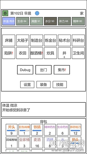 这游戏开局也太寒酸了吧,就给我两块面包,其他的什么都不给我,我都差点活不下去,吃穿用度什么都需要自己亲手弄,开局就一把斧头、两块面包,连一瓶血瓶都不给我,简直就是惨无人道。但后来慢慢找寻到食物、武器、技能,然后建立起营地的时候,还是满满的成就感,无比自豪的发挥出最强战斗力。