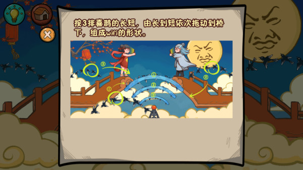 4、可以查看跳到鹊桥对面的方法,将喜鹊依次拖到桥的下面。