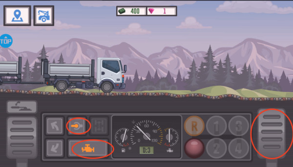4、点击圆圈中的按钮,卡车开始极速的前进,小心避开各种障碍物。