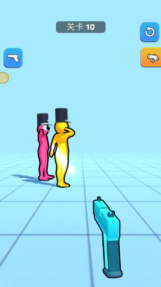 1、控制手枪,调整好角度,瞄准场景中的小人,不断射击,将其击倒。