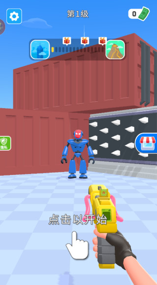 1、进入游戏,第一人称视角拿起武器开始射击,点击开始。