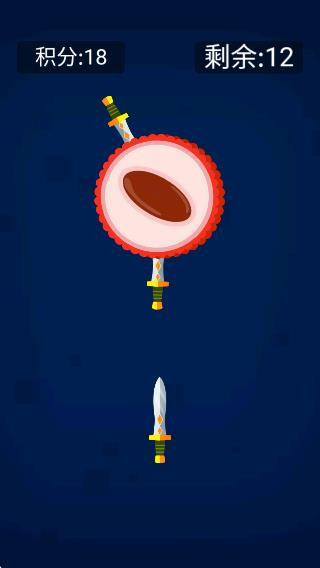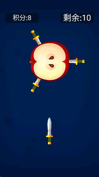 2、屏幕上出现不同的水果,右上角是你需要射击的次数,点击屏幕发射小刀;