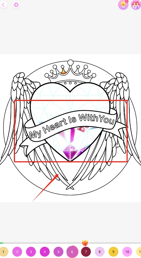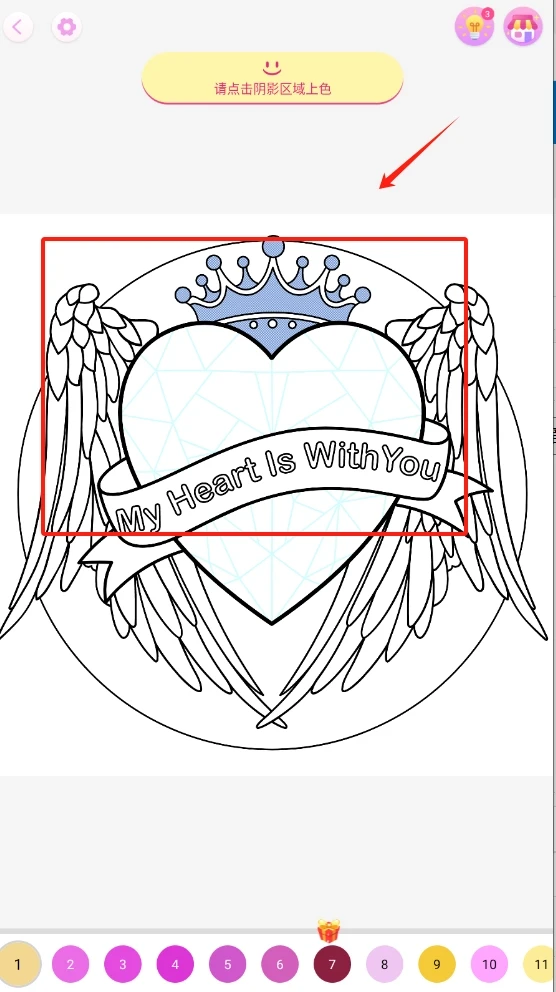 3、挑选彩色宝石的颜色,点击红框区域,为带有翅膀的爱心图案上色并进行装饰吧。