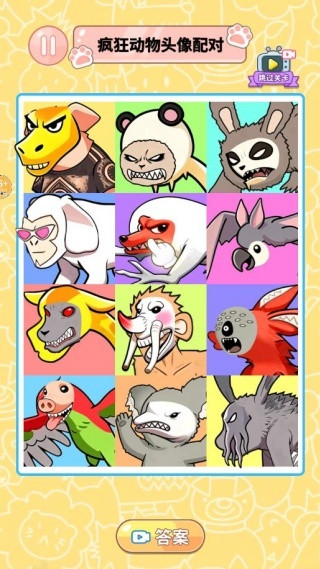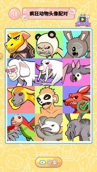 3、在网格中仔细搜寻,找到与抽取头像相同或相关联的另一个搞怪动物头像,完成配对即可过关。
