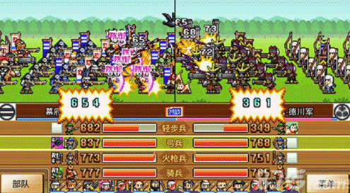 - 在打真德川之前,阵容可以这么配:前排上连击+战术+防铁炮+防足轻(后两个看对面是什么兵种),弓箭队配1个战术,铁炮队配连射+战术+防弓箭,骑兵队配战术+防骑兵。这么一套下来,打到国王军的第42波基本没啥压力。我打到这的时候,武器才+24,衣服才+30。打到这个阶段,就可以开始着手统一全国了,主要目的就是为了赚钱和拿装备。如果碰上对面铁炮兵多的,就把自己人往中后排拉,让弓箭手先把对面的铁炮给点掉。