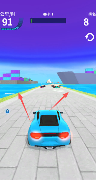 2、需要长按屏幕,才可以让车辆不断的向前,然后左右的滑动,去控制着车辆前进的方向。