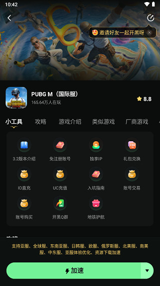 在《PUBG MOBILE》全球服处,点击“加速“就能顺利加速PUBG MOBILE国际服啦,