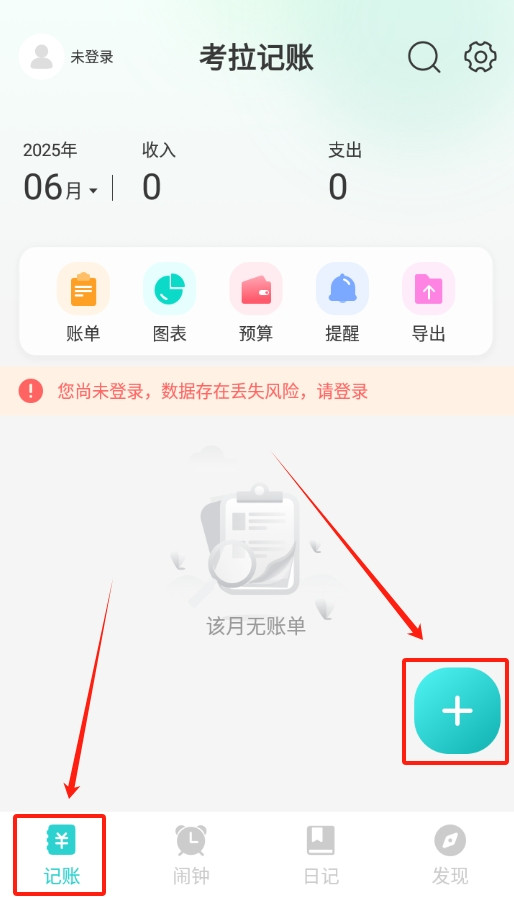 1、进入记账模块,大家能在这里随时看到收入支出情况,也能轻松记账。