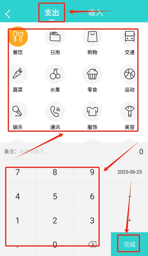 2、进入首页点击记账按钮,选择收支类型后输入金额,添加标签备注,快速完成记账操作。