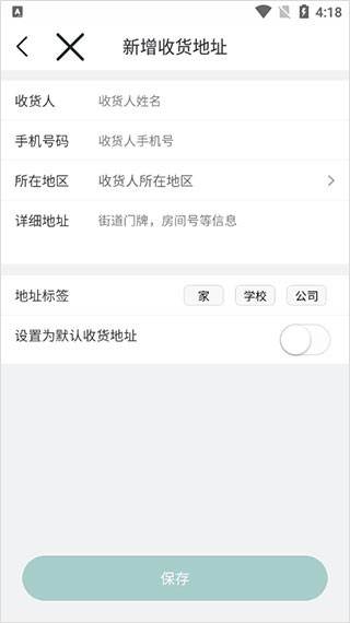 4、进入新增收货地址界面,输入收货人、手机号码、所在地区、详细地址、地址标签,点击【保存】。