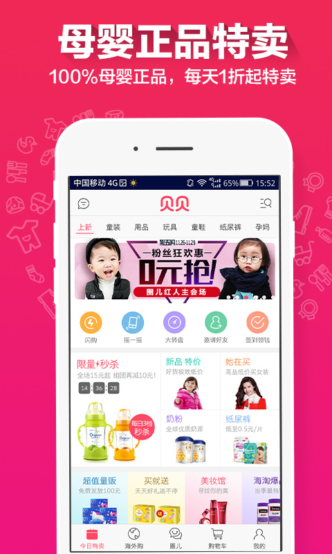 2、与国内外上千家孕婴童品牌供应商保持长期战略合作,提供童装、童鞋、儿童玩具、用品等各类优质商品,每天数十个特卖专场,以1-7折超低折扣限时限量出售,十点准时开抢,抢完即止。