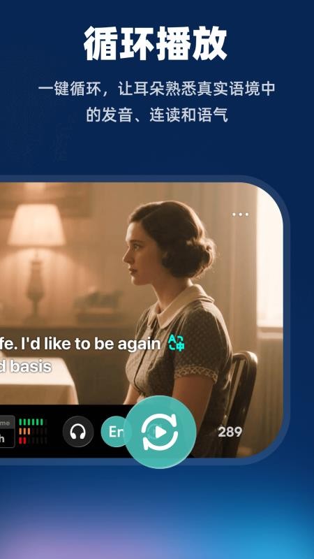 1、智能切分经典美剧台词为独立语句,支持循环播放模式,实现逐句精听训练与即时发音评分。