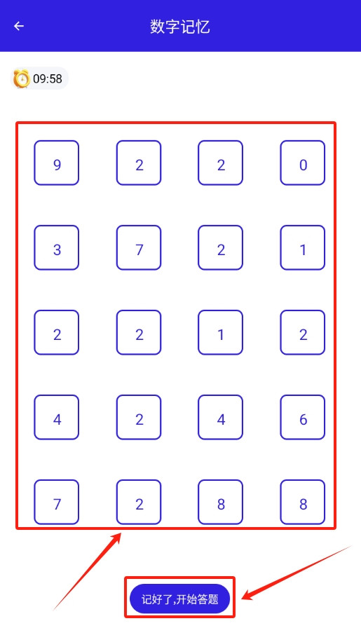 3、仔细记住屏幕上数字的位置和排序,记好后点击 “开始答题”,检验记忆成果。