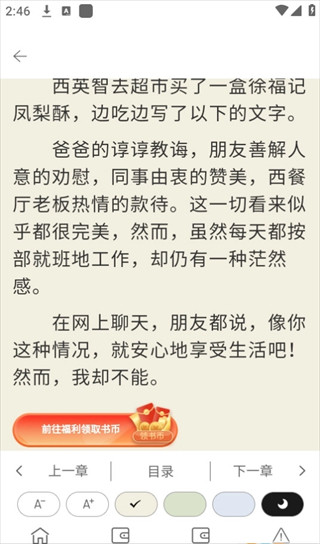 2、阅读界面操作直观,左右滑动翻页,点击中央唤出功能菜单。支持目录跳转、书签添加等实用功能。