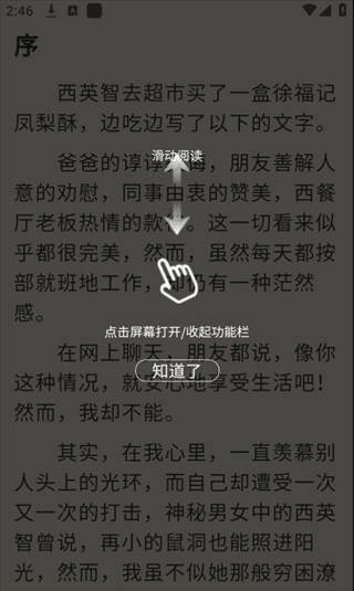 3、首次进入阅读页面可以查看操作指导,点击屏幕中间可以打开功能栏。