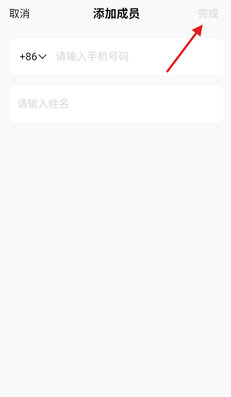 4、在弹出的添加界面输入新成员手机号与姓名,核对信息无误后点击完成添加。